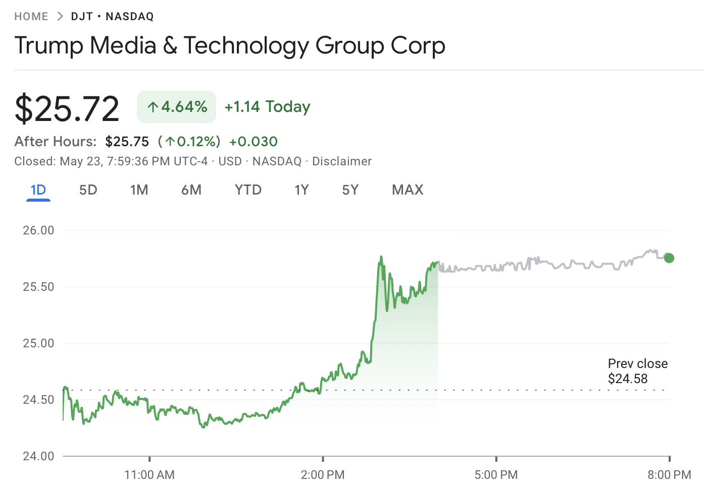 Ожидается, что капитал будет продаваться по рыночной цене по состоянию на закрытие 23 мая. В этот день цена акций закрыта на уровне 25,72 долл., Здесь отмечено увеличение на 4,6% в день. Рыночная капитализация Трампа СМИ составила 5,7 млрд. Долл. США по состоянию на 23 мая.