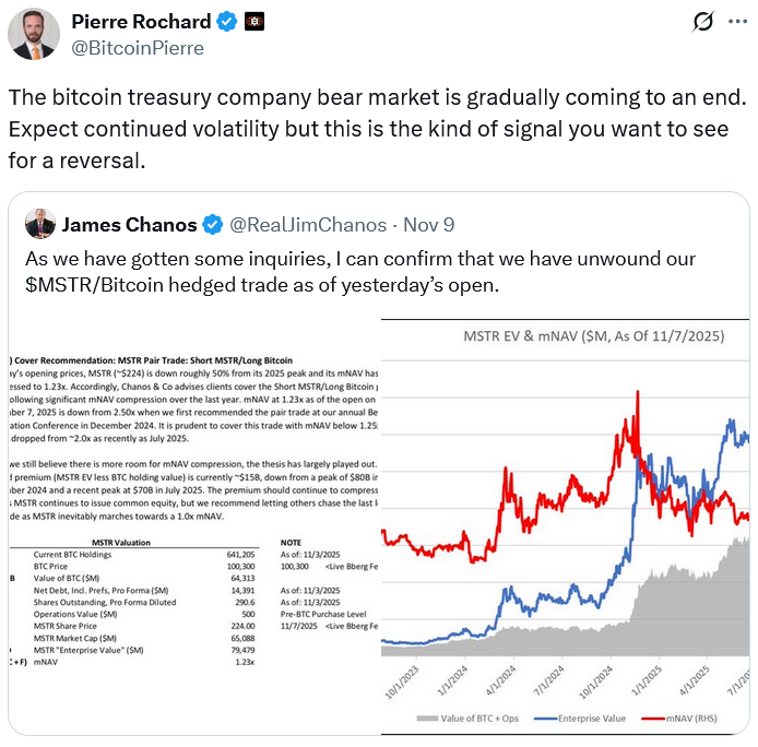 «Было бы разумно покрыть эту сделку коэффициентом mNAV ниже 1,25x, который упал с ~2,0x совсем недавно, в июле 2025 года», — написал Чанос в примечании.