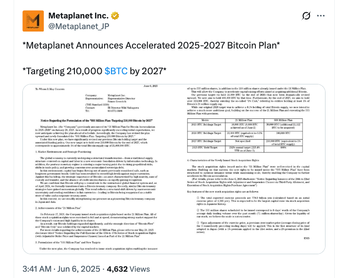 Metaplanet 6 июня опубликовала свой новый план приобретения Биткоин (BTC), который значительно повысил свою предыдущую цель в 21 000 BTC к концу 2026 года.