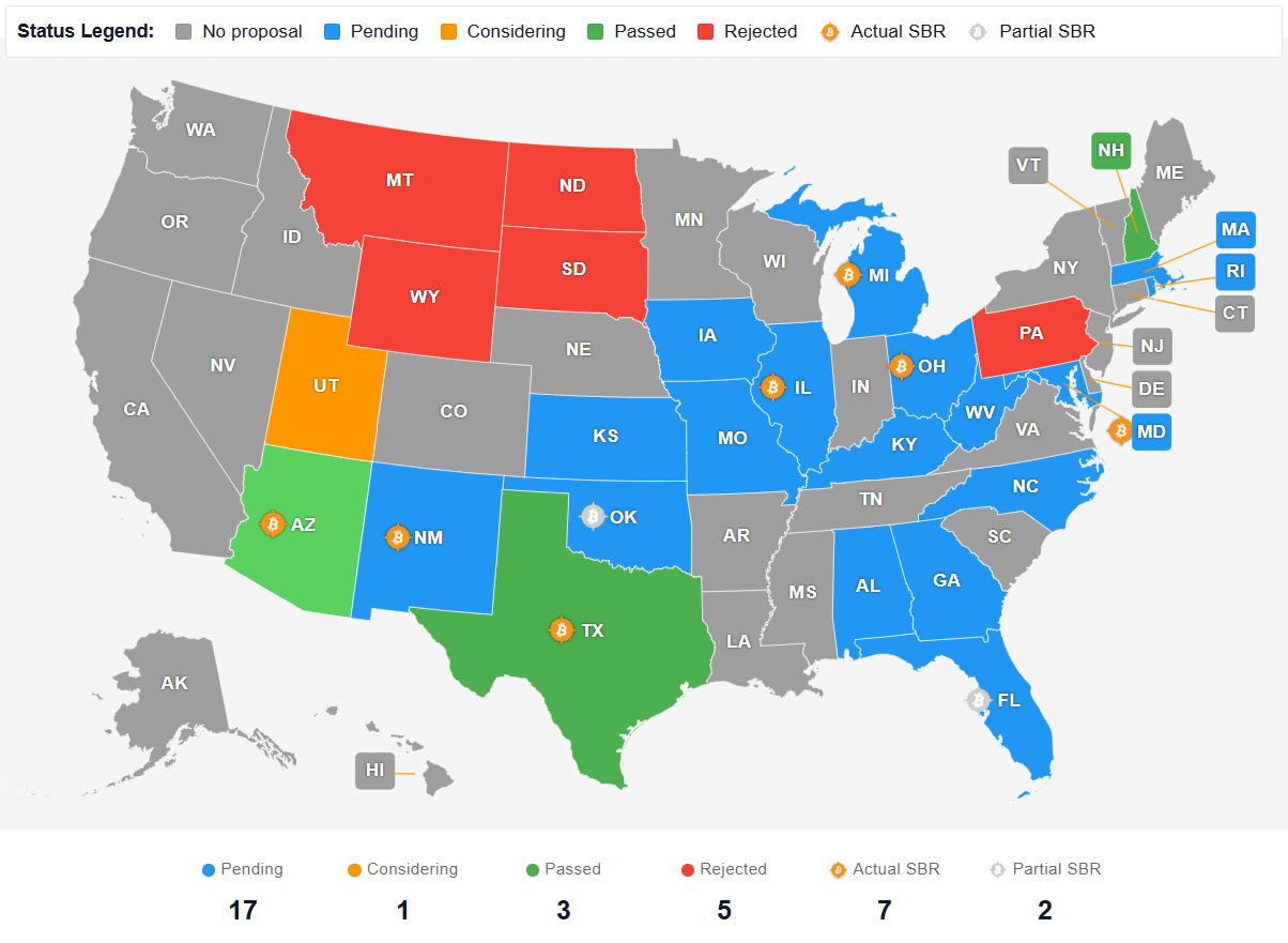 Стратегические биткоинские резервные законопроекты были отклонены в Монтане, Северной Дакоте, Южной Дакоте, Вайоминге и Пенсильвании, и есть 17 других штатов с ожидающим законодательством, согласно Bitcoin Reserve Monitor.