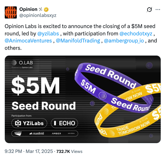 В марте 2025 года Opinion Labs получила начальное финансирование в размере 5 миллионов долларов под руководством YZi и при участии других инвесторов, таких как Echo, Animoca Ventures, Manifold Trading и Amber Group.