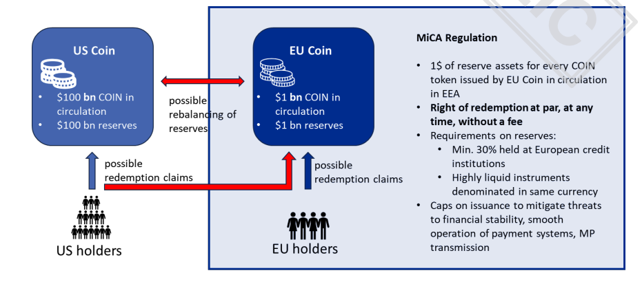 Согласно Комиссии, риски совместного выпуска стаблекоина с третьими странами управляются с существующей политикой, поскольку эмитенты могут быть необходимы для того, чтобы иметь механизм восстановления перебалансировки для обеспечения того, чтобы запасы в токенов ЕС в ЕС в ЕС.
