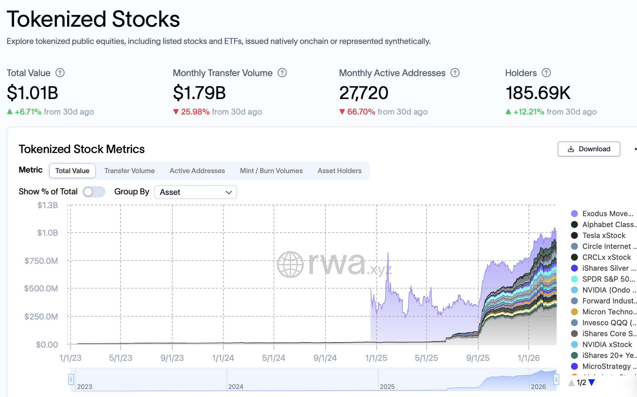 По данным RWA.xyz, общая стоимость токенизированных публичных акций выросла примерно до $1,01 млрд.