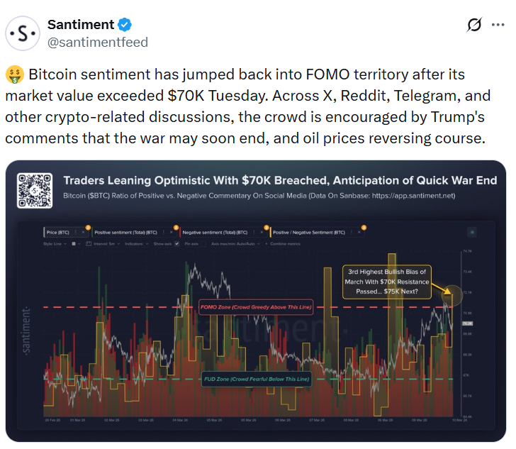 Настроения в социальных сетях по поводу Биткоина вернулись к оптимизму, поскольку во вторник Биткоин восстановился до более чем 70 000 долларов, что было вызвано недавними комментариями президента США Дональда Трампа о том, что война с Ираном может близиться к концу.