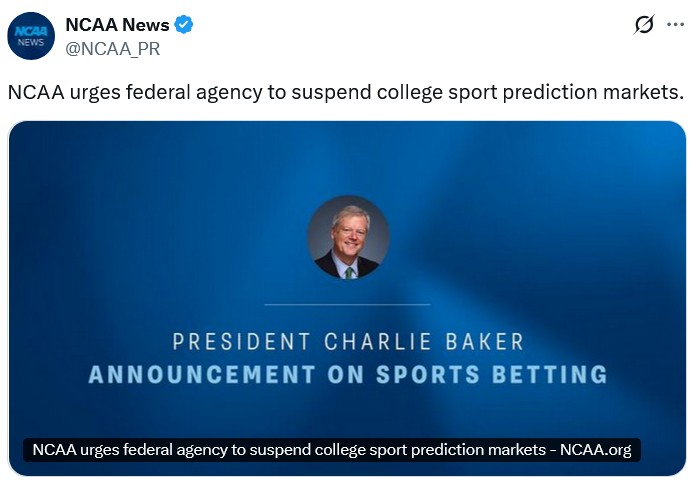 Президент NCAA Чарли Бейкер в письме в среду обратился к председателю CFTC Майклу Селигу с просьбой «приостановить деятельность университетских рынков спортивных прогнозов до тех пор, пока не будет создана более надежная система с соответствующими гарантиями».