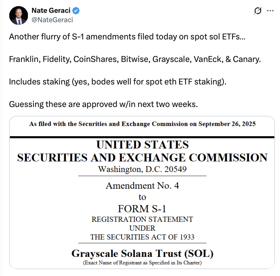 По словам аналитика ETF (ETF), несколько заявлений на обменные фонды, пройденные Solana, могут получить одобрение США к середине октября, сказал аналитик ETF Нейт Герачи после новых регулирующих документов.