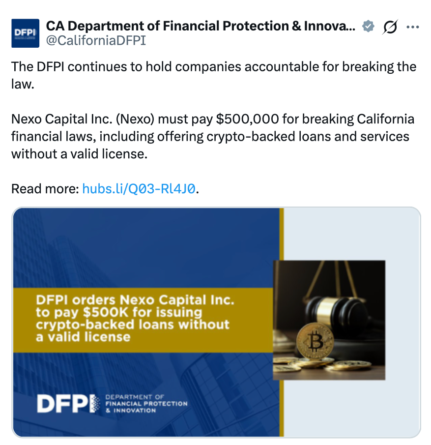 DFPI заявляет, что кредиты Nexo подвержены повышенному риску дефолта
