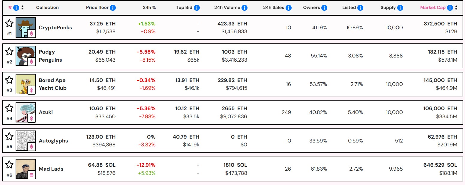 Mad Lads, коллекция невзаимозаменяемых токенов (NFT) на блокчейне Solana, поднялась на шестое место среди самых ценных NFT по минимальной рыночной капитализации.