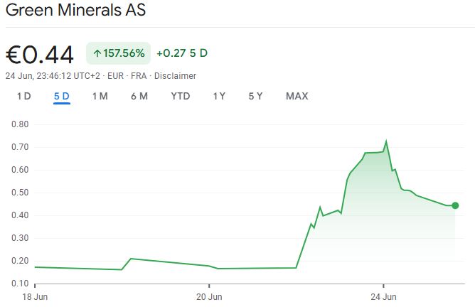 Акции в зеленых минералах закрылись на 300% прибыли в понедельник с его объявлением, увеличившись до 68 центов евро (79 центов);Тем не менее, цена его акций упала во вторник, чтобы закрыть более 34% до 44 центов евро (51 цент), показывают данные Google Finance.