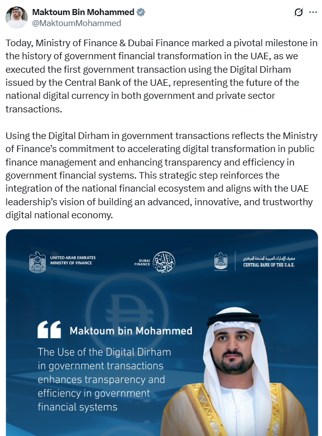 Агентства заявили, что эта транзакция была первой для правительства ОАЭ и стала «шагом к более широкому внедрению национальной цифровой валюты в операциях как государственного, так и частного сектора».