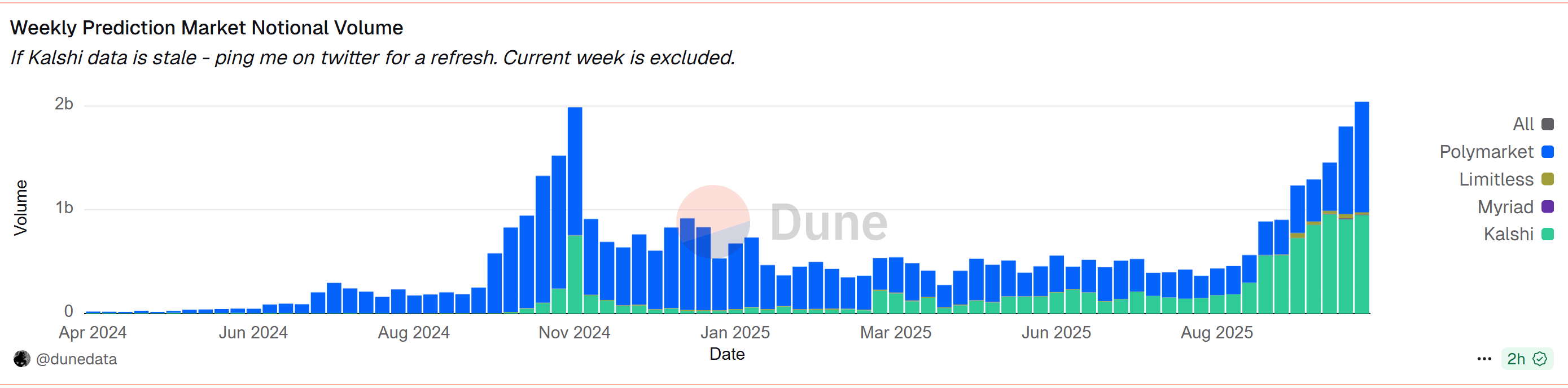 Согласно данным Dunedata через Dune Analytics, глобальный интерес к рынкам прогнозов достиг нового уровня: в середине октября еженедельные объемы торгов впервые превысили 2 миллиарда долларов.