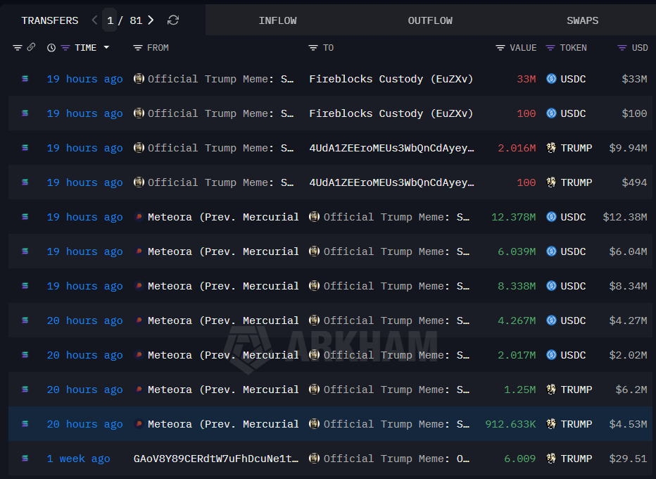 Публичные записи Solana на Solscan подтверждают крупные оттоки USDC из кошельков, связанных с TRUMP.