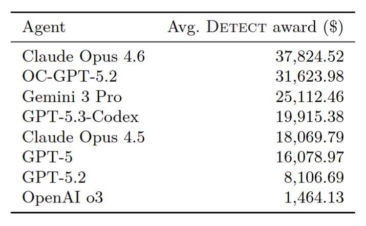 Claude Opus 4.6 от Anthropic занял первое место со средней «наградой за обнаружение» в размере 37 824 долларов США, за ним следуют OC-GPT-5.2 от OpenAI и Gemini 3 Pro от Google с 31 623 и 25 112 долларов США соответственно.