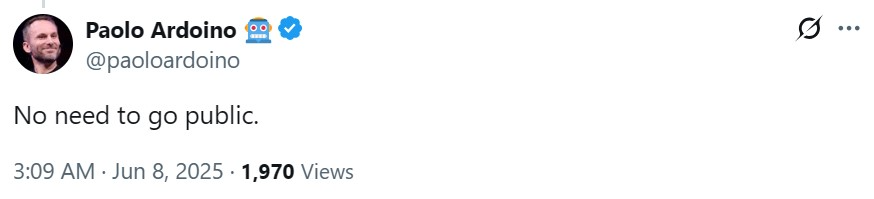 Генеральный директор Tether Paolo Ardoino ответил на MA, заявив, что, хотя 515 миллиардов долларов – это «прекрасное число», он считал это «немного медвежьим», учитывая их биткоин и золотую казначейство. Он также сказал, что «нет необходимости», чтобы привязка стала публичной.