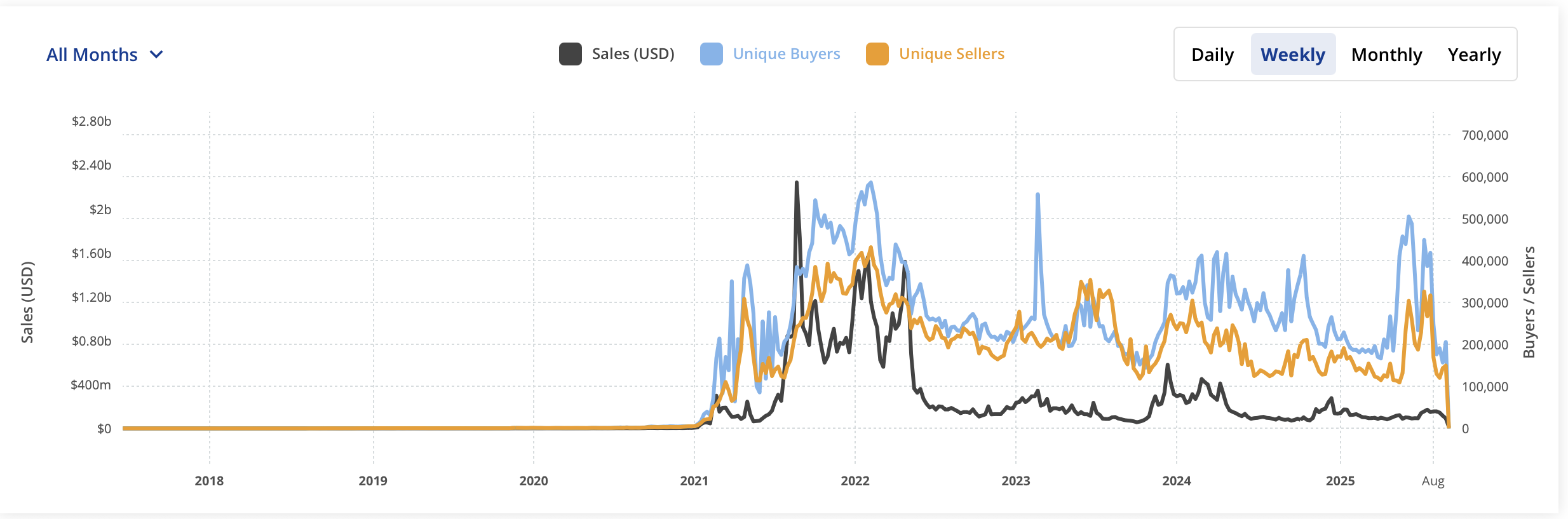 Сектор NFT показал признаки возвращения в последние недели, согласно данным CryptoSlam, с продажами в период с июля по август от 115,4 млн. Долл. США до 170,5 млн. Долл. США. Этот импульс охладился в сентябре, когда еженедельные продажи сокращаются до 92 миллионов долларов.