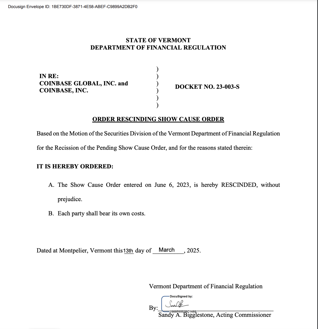 Департамент финансовых учреждений Кентукки стал третьим регулятором на уровне штата, отклонив свой иск Coinbase, положив конец судебному разбирательству 26 марта.
