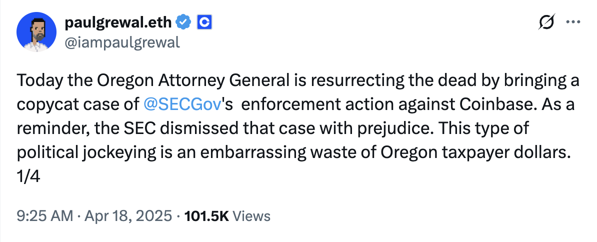 Генеральный прокурор штата Орегон Дэн Рэйфилд планирует иск против обмена криптовалют Coinbase, утверждая, что компания продает незарегистрированные ценные бумаги жителям штата США после того, как Комиссия США по ценным бумагам и биржам Соединенных Штатов прекратила свое федеральное дело против обмена.