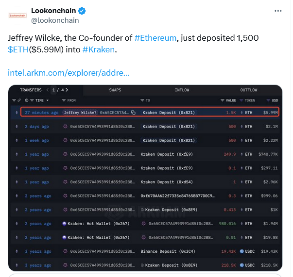 Соучредитель Ethereum Джеффри Уилке может продать некоторые из своих эфирных акций после того, как в четверг отправила около 1500 ETH для обмена криптовалютой Кракена.