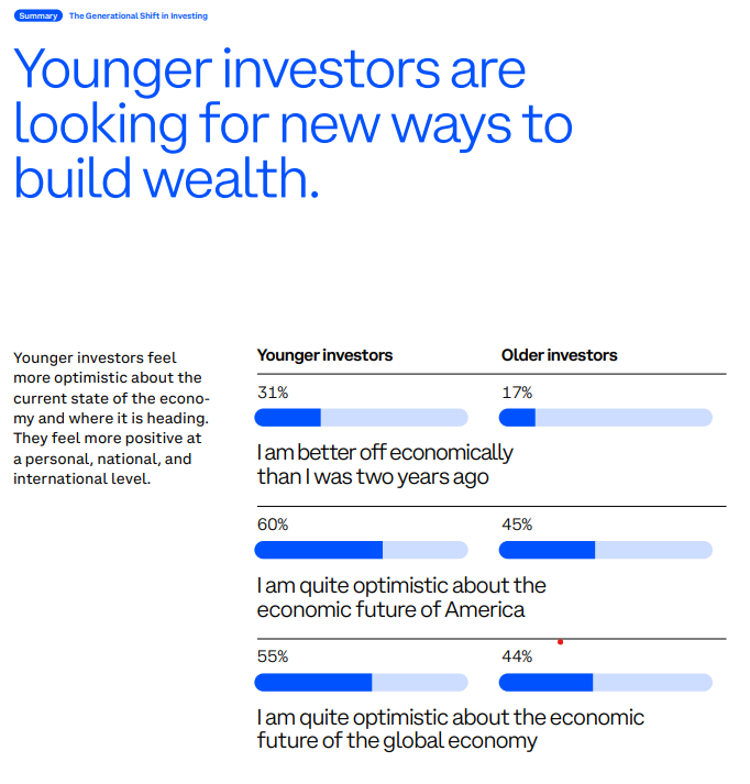 Цифры из последнего отчета Coinbase «Состояние криптовалют» подтверждают его мнение. Исследование, проведенное Ipsos в четвертом квартале, показывает, что инвесторы поколения Z и миллениалов торгуют чаще, берут на себя больший риск и вкладывают гораздо большую часть своих портфелей в криптовалюту и другие нетрадиционные активы, чем старшие поколения.