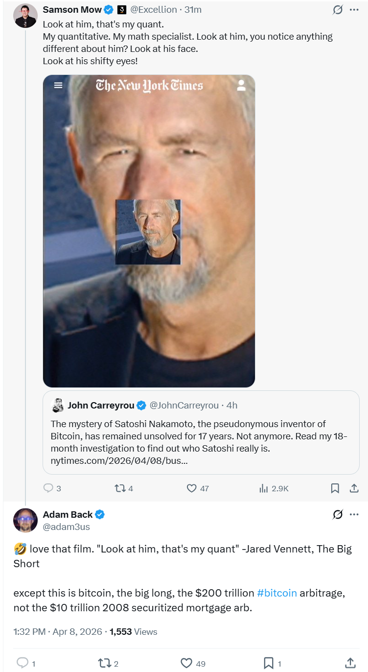 Расследование провел Джон Керрейру, французско-американский журналист-расследователь, наиболее известный благодаря разоблачению мошенничества с Theranos. В отчете он утверждает, что Бэк, которого цитирует Накамото в официальном документе о Биткоине, в течение многих лет активно обсуждал электронные деньги, затем исчез, как только появился Биткоин (BTC), только для того, чтобы появиться снова после исчезновения Сатоши.
