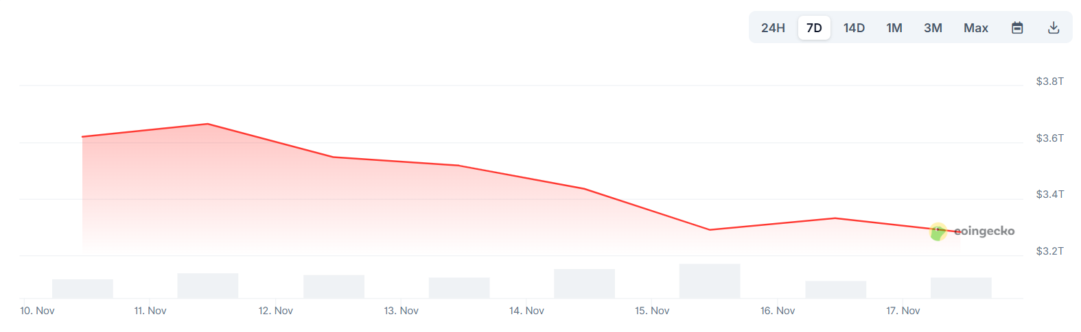 Биткоин ненадолго упал до минимума с начала года в 93 029 долларов в воскресенье. По данным CoinGecko, общая рыночная капитализация также снизилась за последние семь дней: с $3,7 трлн 11 ноября до $3,2 трлн в понедельник.