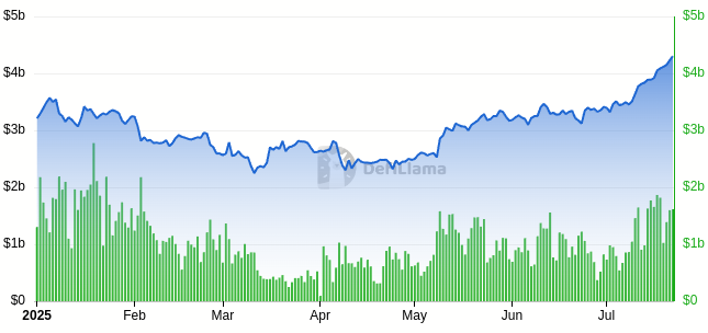 Объявление происходит, поскольку общая стоимость базы (TVL) достигла нового максимума в 4,295 млрд долларов, согласно данным Defillama. Это составляет 33,75% по сравнению с его TVL на 3,211 миллиарда долларов, о котором сообщается 1 января.