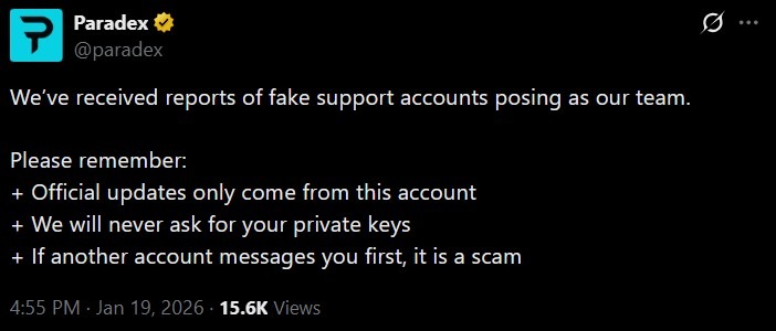 Во время сбоя Paradex опубликовал официальное предупреждение против фейковых аккаунтов поддержки, выдающих себя за его команду. DEX посоветовала трейдерам полагаться только на официальные каналы связи.