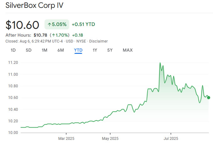 Акции в Silverbox Corp IV добились незначительных прибылей в этом году, по сравнению с рекордно высокой в июне в размере 11,20 долл. США, до того, как с января было достигнуто прибыль в размере 5%.
