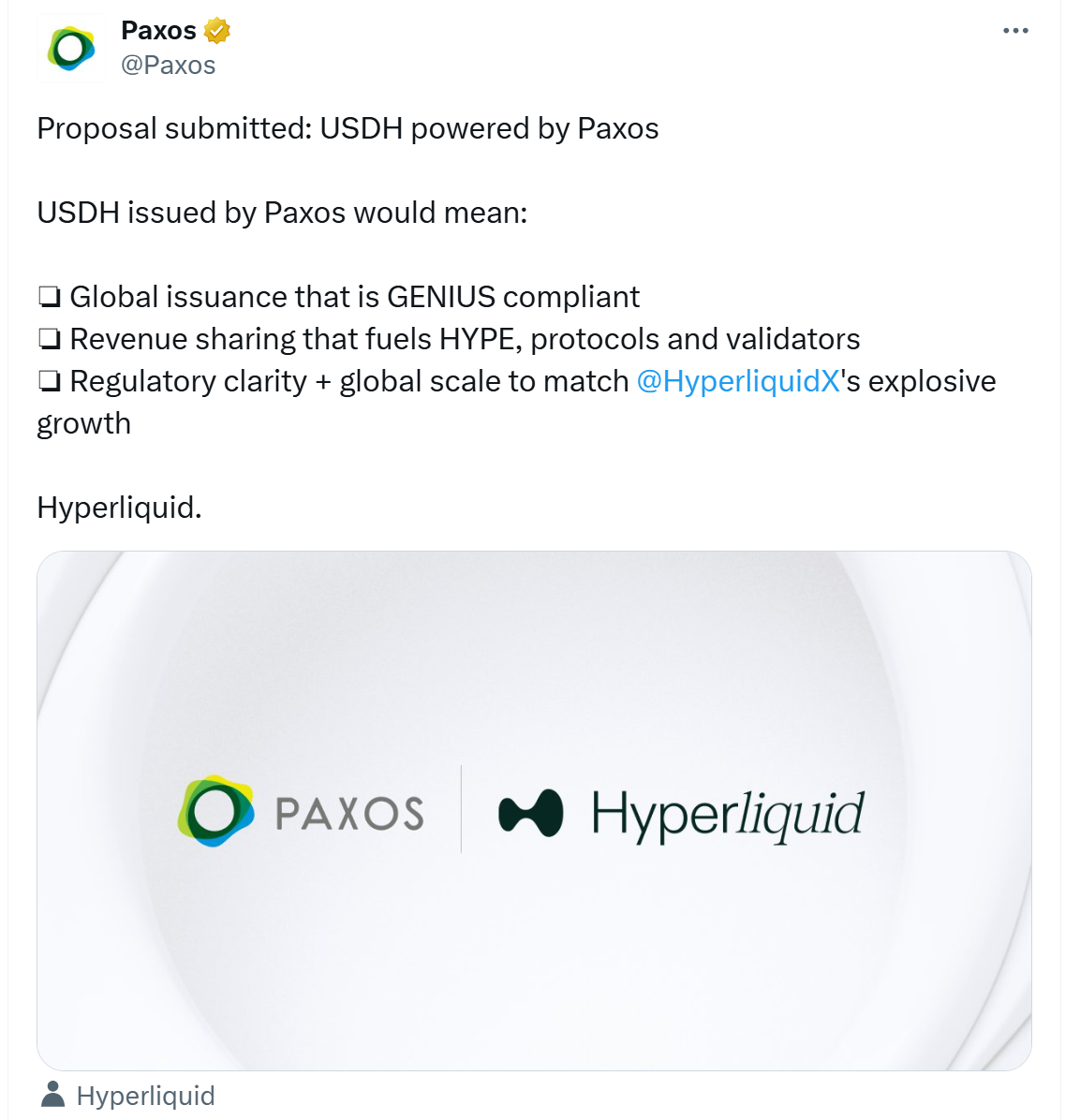 Инфраструктурная фирма Stablecoin Paxos представила предложение о запуске USDH, гиперликвидном конюшне, который будет полностью соответствовать руководящему и устанавливающему национальному Закону о стаблекоин США (Genius Act) и рынках в крипто-акциях (схенах).