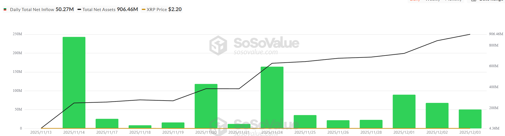 По данным SosoValue, спотовый ETF XRP (XRP) продолжает лидировать среди дебютирующих в этом году альткойн-ETF с притоком в $243 млн в первый день.