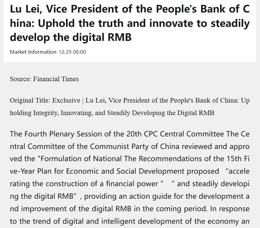 Новая структура CBDC позволит банкам рассматривать цифровой юань как часть своих операций с активами и пассивами, написал Лу Лэй, заместитель управляющего Народного банка Китая, в статье China Financial News, связанной с НБК, переизданной Sina Finance в понедельник.