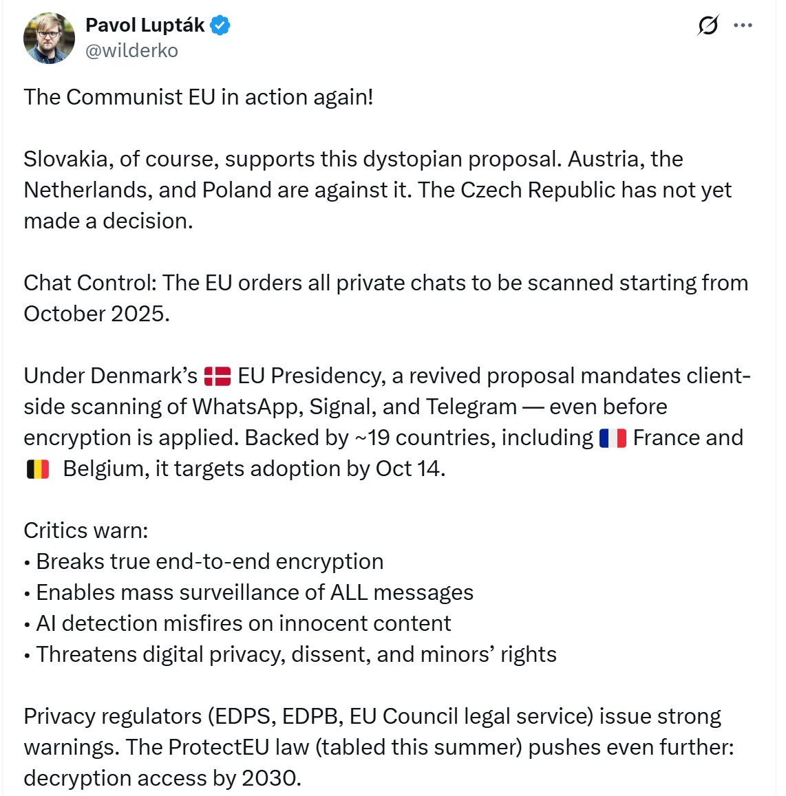 Он добавил, что настоящая цель не преступниками, которые используют зашифрованные или децентрализованные каналы, а обычные пользователи, чьи личные разговоры теперь будут открыты для алгоритмического изучения.