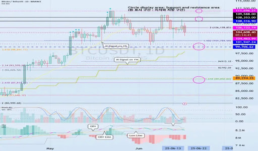 По словам аналитика, дата 22 июня важна, потому что она совпадает с слиянием ключевых уровней цен с индикатором M-Signal на еженедельном диаграмме. Этот показатель в настоящее время растет и выравнивается около уровня HA-высокого уровня за 99 705 долларов. Если биткоин падает ниже этого уровня, это может сигнализировать о начале более глубокого корректирующего хода, возможно, к ежемесячной линии M-Signal или даже в области 89 294 долл. США, что соответствует 2,618 Fibonacci.