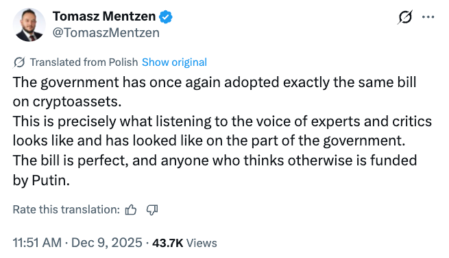 «Правительство в очередной раз приняло точно такой же законопроект о криптоактивах», — написал Ментцен в посте X во вторник.