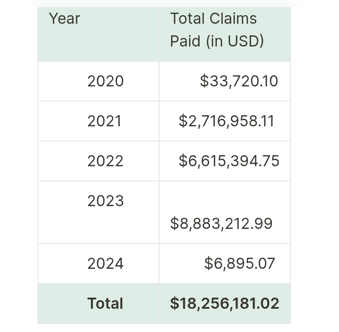 Nexus Mutual поддерживает прозрачную историю претензий и позволяет ее проверке Onchain. С момента своего создания в 2020 году, служба, как сообщается, выплатила его пользователям в размере 18 256 181 долл. США.