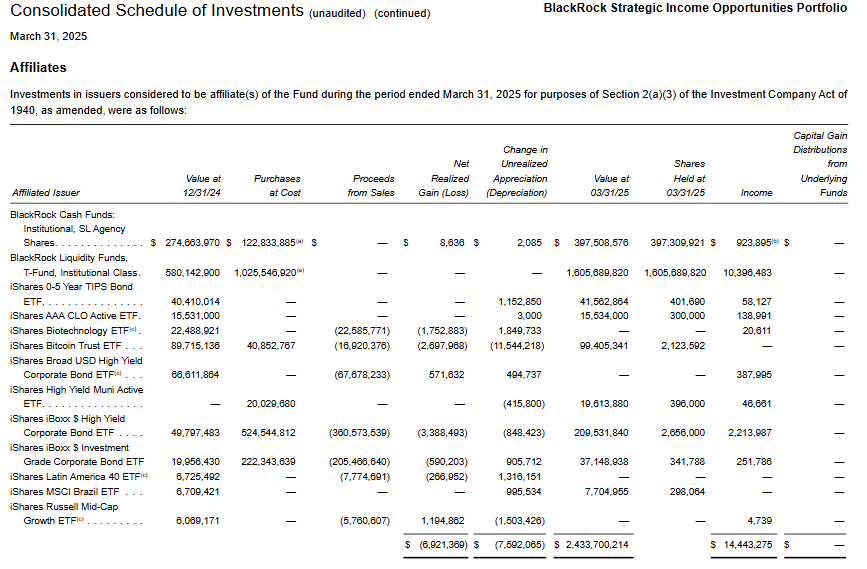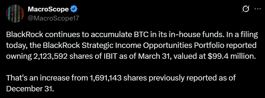 По состоянию на 31 марта 2025 года портфель стратегических возможностей для стратегических доходов BlackRock владел 2123 592 акциями компании Ishares Bitcoin Trust (IBIT), оцененной в 99,4 млн. Долл. США, согласно заявкам в Комиссии по ценным бумагам и биржам США (SEC). Это заметный рост с 31 декабря 2024 года, когда портфель владел 1 691 143 акциями IBIT.