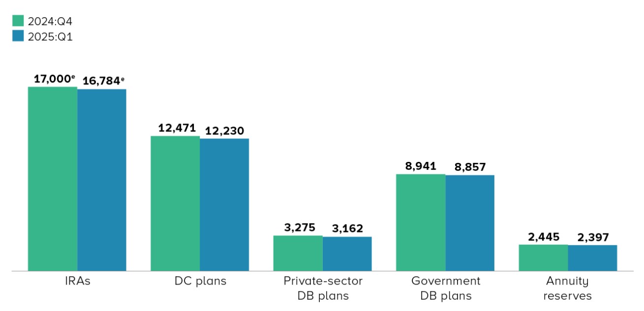По данным Института инвестиционной компании и Совета Федеральной резервной системы и Совета Федеральной резервной системы и Совету Федеральной резервной системы и Совету Федеральной резервной системы и Совету Федеральной резервной системы, пенсионные активы США составили 43,4 триллиона долларов США. Определенные планы по обращению, в том числе 8,7 триллиона долларов в 401 (k) с, составили более 12 триллионов долларов.