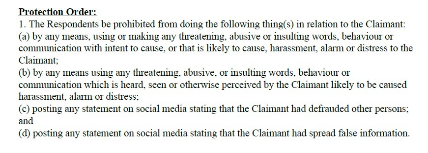 Постановление суда запрещает угрожающие, оскорбительные или оскорбительные сообщения и требует от ответчиков выплатить в общей сложности 2500 сингапурских долларов (около 1900 долларов США) в качестве компенсации и судебных издержек до 7 апреля.