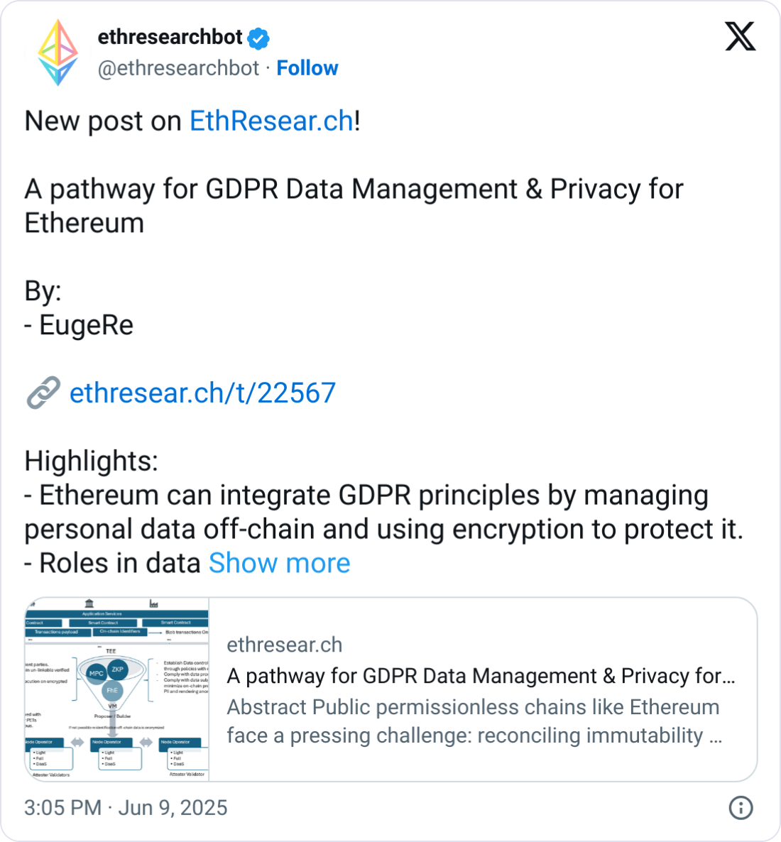 Уровень выполнения будет работать как процессоры, передающие только зашифрованные или слепые данные, в то время как консенсус-уровень будет проверять исключительно обязательства и доказательства нулевого знания. Наконец, уровень доступности данных под Peerdas будет хранить только анонимные осколки для ограниченных сроков, что приведет к тому, что они соответствуют принципу минимизации данных GDPR.