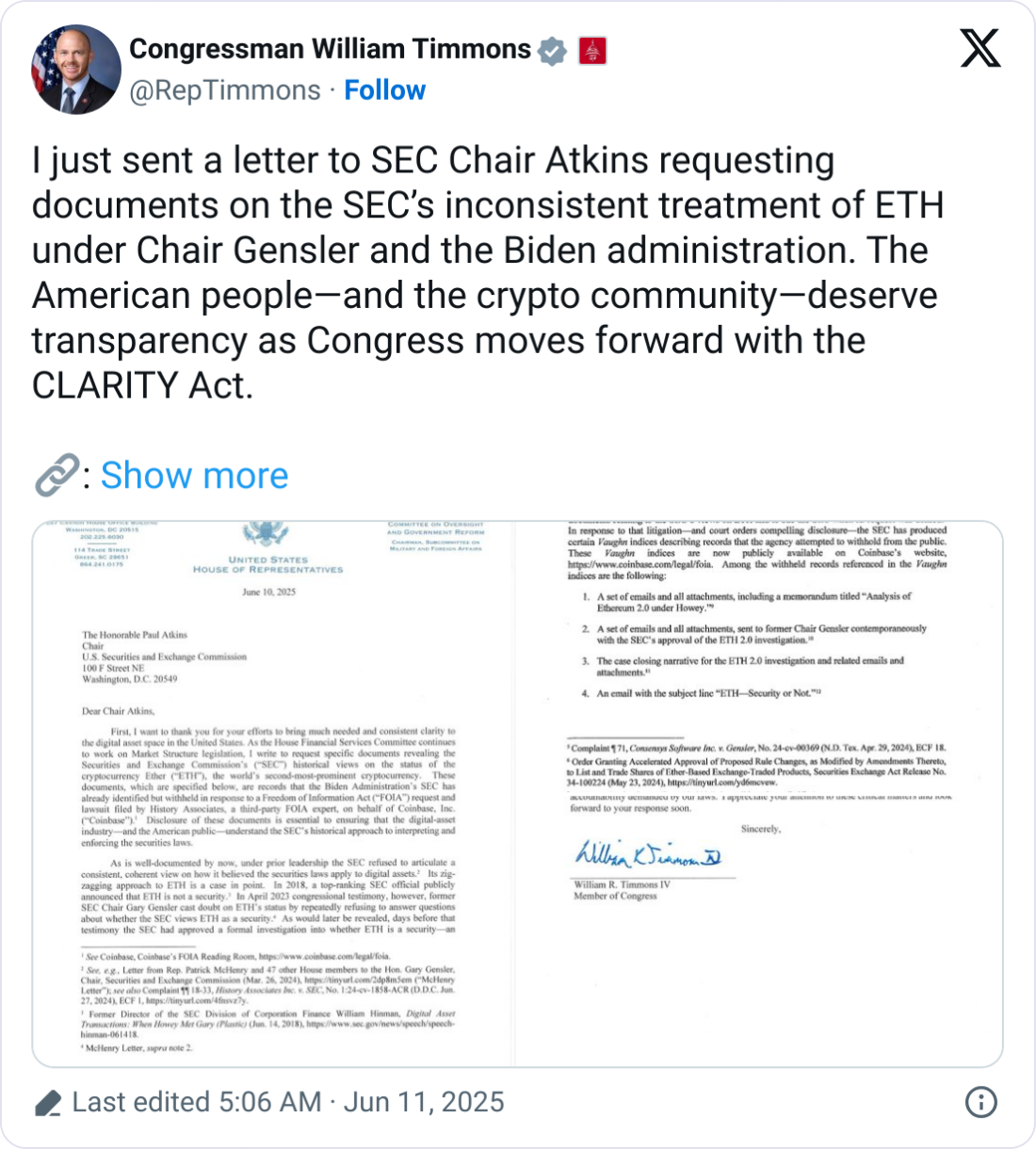 Письмо Тиммонса последовало за запросом Закона о свободе информации (FOIA), подкрепленного Cryptocurrents Exchange Coinbase в 2023 году, который попросил SEC документы о его взглядах на ETH.