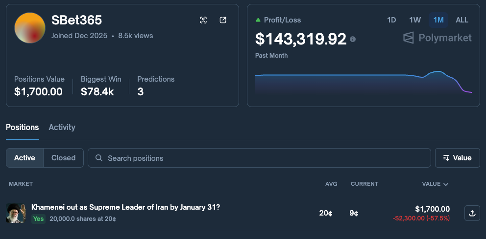 Оставшийся кошелек «SBet365» сделал еще одну ставку два дня назад, предсказав, что верховный лидер Ирана аятолла Али Хаменеи будет свергнут к 31 января, отметил Lookonchain.