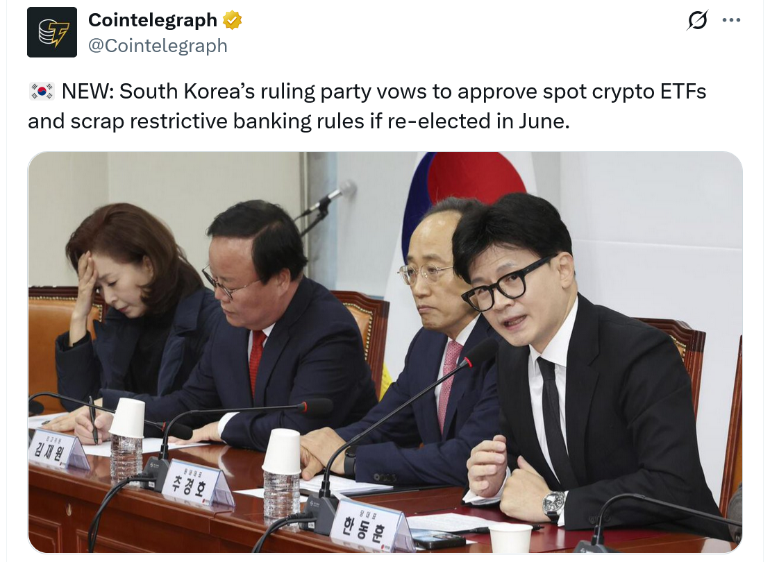 Правящая партия Южной Кореи, Народная партия власти, также, как сообщается, дала обещания криптовалюты в конце апреля, которая включала в себя разрешение ETF-криптовалюты, демонтируя спорное правило в одноименном обмене, и установление регулирующей основы для стаблеков.