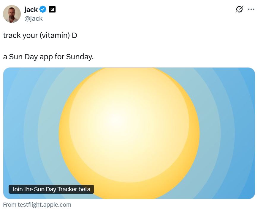 В воскресенье Дорси поделился приложением «Солнечный день» со своими последователями на Х, который, согласно своей белой статье о Github, «вычисляет синтез витамина D из ультрафиолетового воздействия с использованием мультифакторной модели, основанной на научных исследованиях».