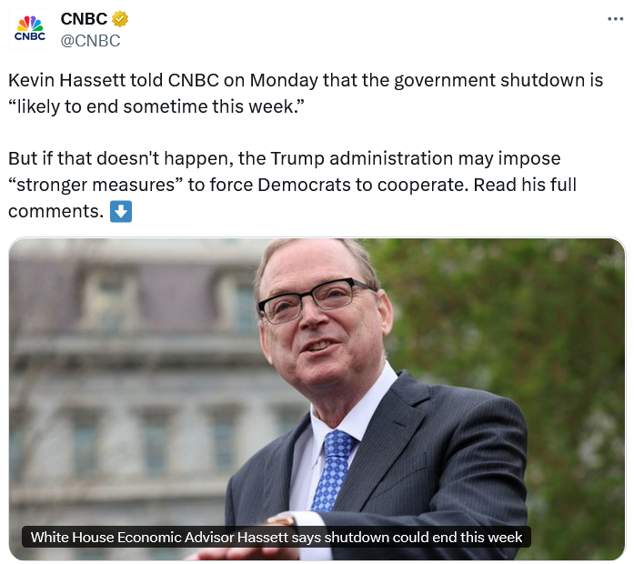 «Я думаю, что приостановка работы Шумера, вероятно, закончится где-то на этой неделе», — сказал Хассетт в понедельник в программе Squawk Box на канале CNBC, имея в виду лидера сенатского меньшинства Чака Шумера, на которого республиканцы указали пальцем за то, что он спровоцировал приостановку работы правительства.