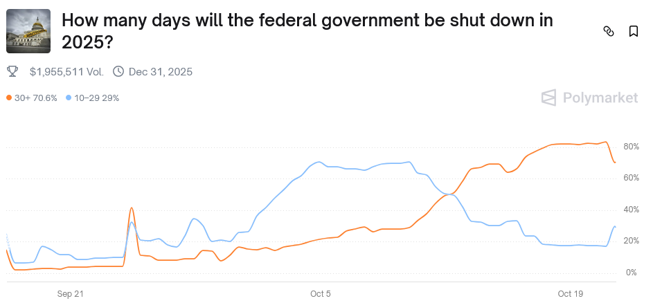 Несмотря на оптимизм Хассетта, по оценкам Polymarket, существует вероятность 71%, что остановка продлится дольше, чем 30 дней, то есть как минимум до 31 октября.