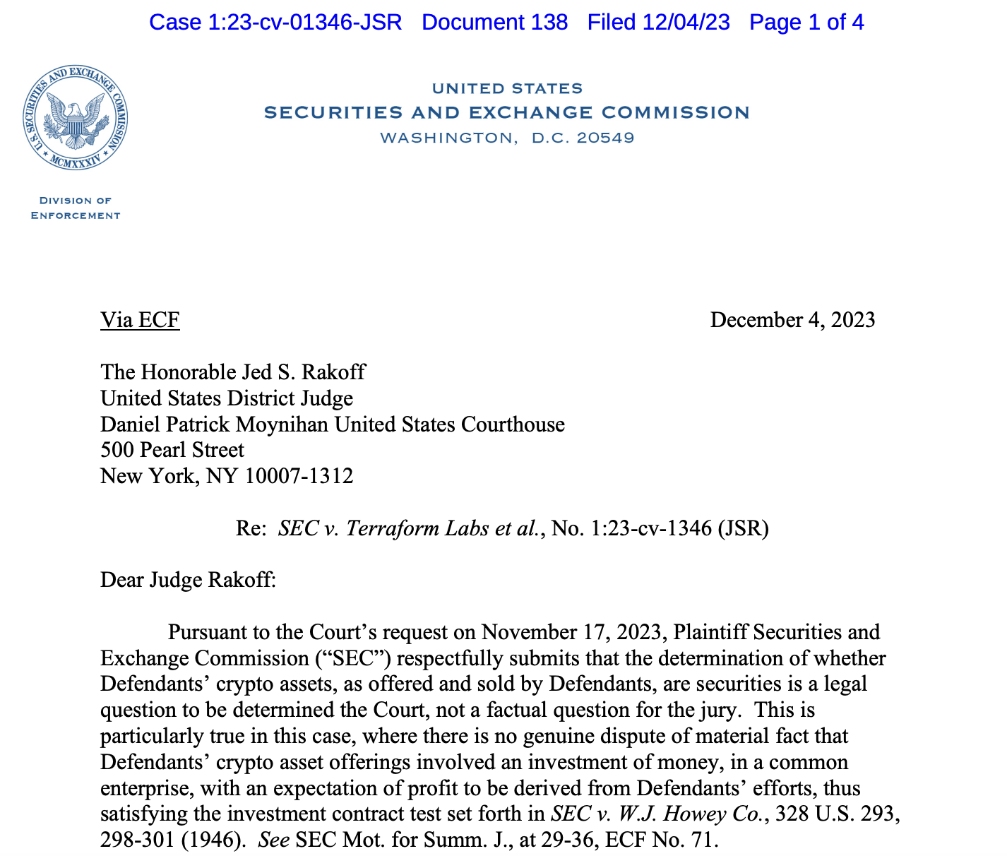В заявлении от 4 декабря, поданном в Окружной суд США Южного округа Нью-Йорка, Комиссия по ценным бумагам и биржам (SEC) утверждала, что вопрос о криптовалютах как ценных бумагах в соответствии с руководящими принципами комиссии является «юридическим вопросом, который должен быть решен [Судом], а не фактическим вопросом. для жюри». По мнению SEC, отправка вопроса о том, квалифицируются ли определенные криптовалюты в деле Terraform Labs как ценные бумаги в соответствии с тестом Хоуи — стандартом комиссии для определения того, что является ценной бумагой, — открыла этот вопрос для обсуждения.