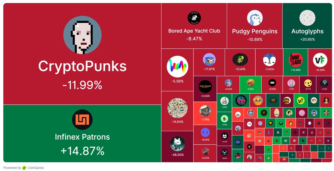 Данные CoinGecko показали, что большинство крупнейших коллекций NFT отражают более широкий спад рынка: CryptoPunks, крупнейшая по рыночной капитализации, упала на 12% за последние 30 дней.