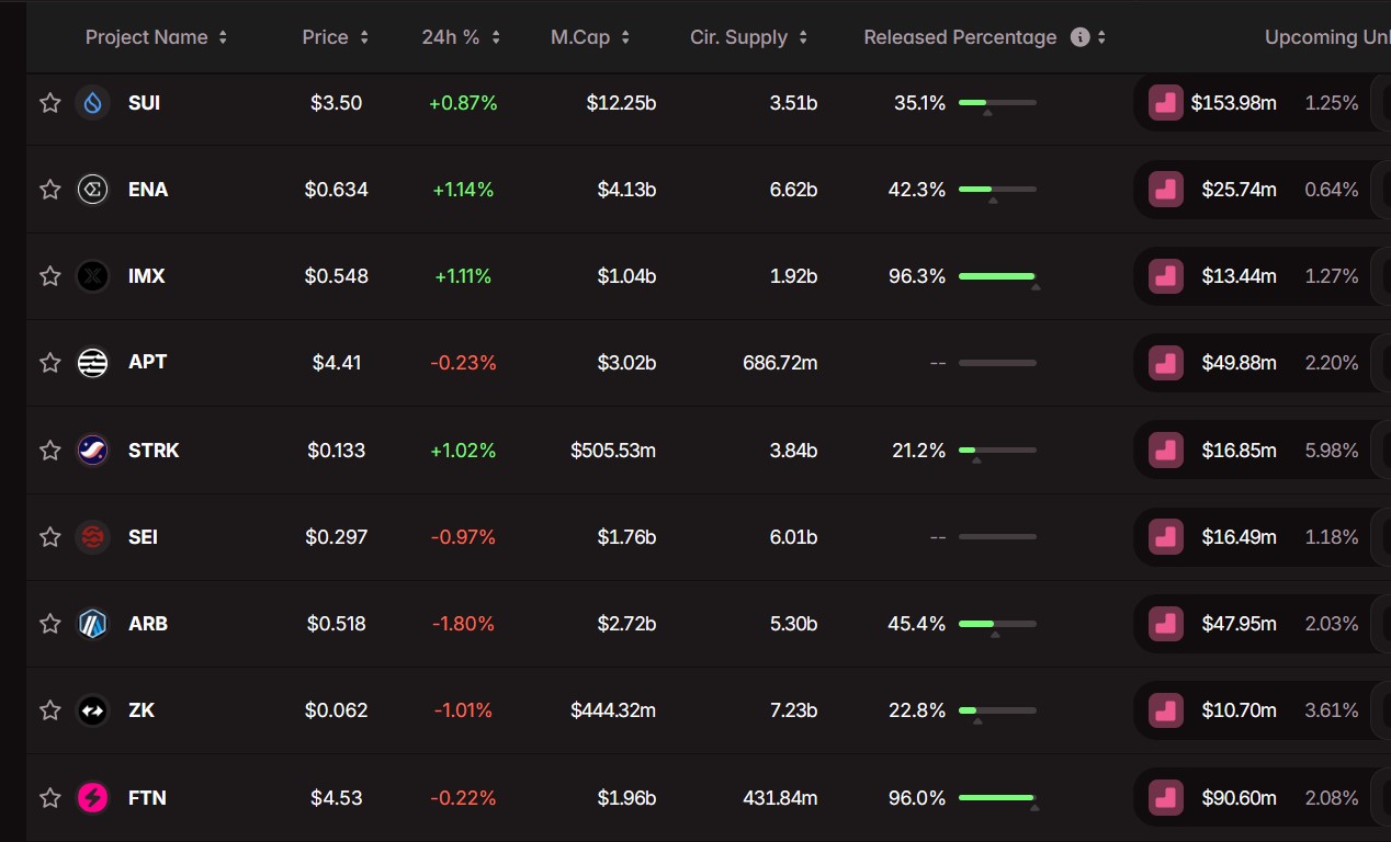 FTN занял второе место с токенами в размере 90 миллионов долларов, которые будут добавлены в предложение. В отличие от SUI, FTN уже выпустила более 96% своих токенов. Это означает, что разблокировка представляет собой меньшее относительное увеличение поставок.