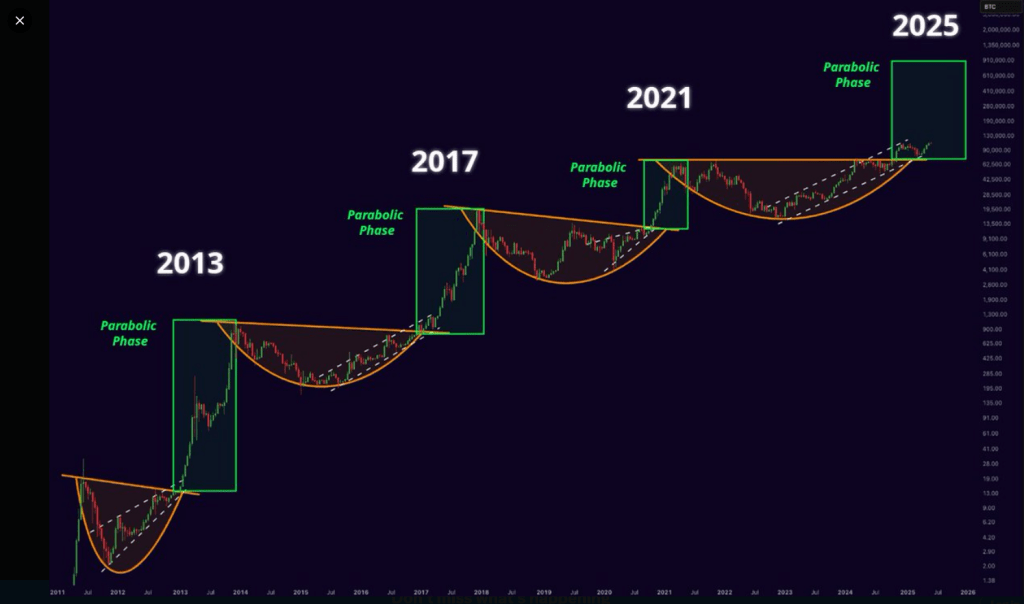 Диаграмма Mister Crypto предполагает, что период после 2021 года сформировал другую базу. Если история разыгрывается так же, его прогноз указывает на прорыв в 2025 году, который может отправить биткоин до 900 000 долларов США – на 760% с сегодняшнего уровня.