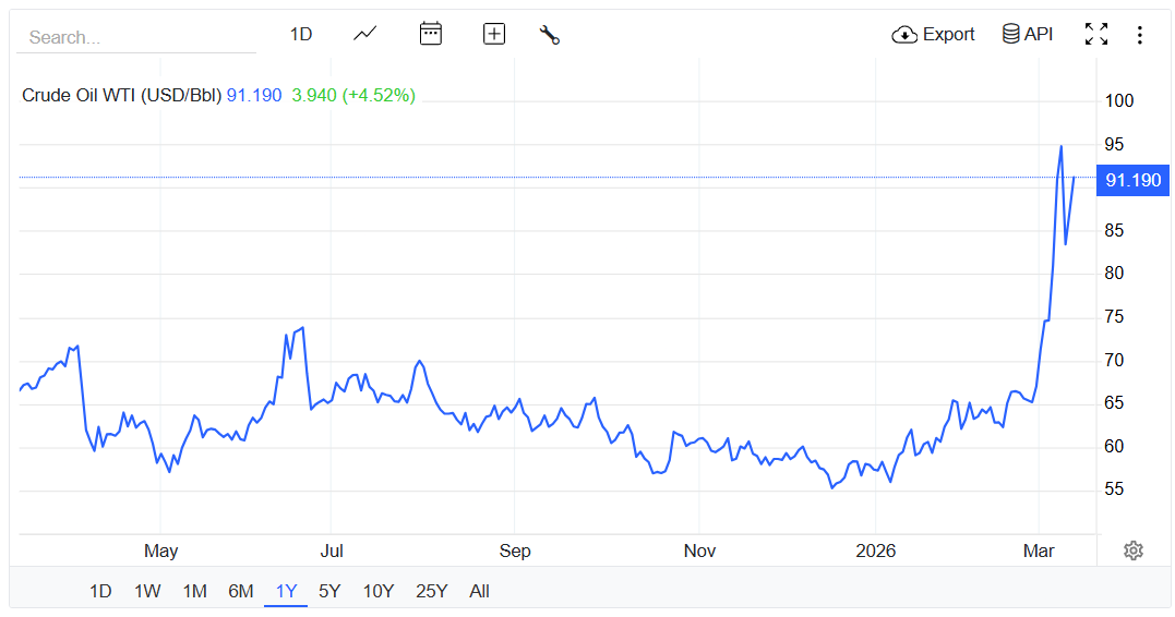 По данным Trading Economics, цена на сырую нефть в четверг ненадолго выросла до $95 за баррель, поскольку конфликт вступил в свой 13-й день.